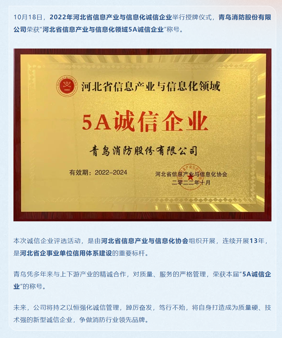 青鳥消防榮獲“河北省信息產(chǎn)業(yè)與信息化領(lǐng)域5A誠(chéng)信企業(yè)”稱號(hào)