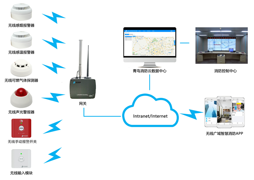 采用基于物聯(lián)網(wǎng)技術,運用云計算、大數(shù)據(jù)的全新智慧防火系統(tǒng)解決方案,在建筑物內配備健全的物聯(lián)網(wǎng)化的消防設備,實時在線監(jiān)測現(xiàn)場消防設備的運行情況,可將所有火警信息通過有線或4G網(wǎng)絡(由于校園網(wǎng)通常為內部專網(wǎng),網(wǎng)關無法自動獲取IP地址,因此推薦網(wǎng)關選擇4G作為上行信道)直接上傳至青鳥消防云平臺,平臺將報警信息通過手機APP、電話、短信等方式及時通知相關負責人,便于消防隱患及時處置,能夠真正的提高校園消防安全管理的能力,有效防范火災事故的發(fā)生,極大程度地保障校園學生的生命和財產(chǎn)安全。